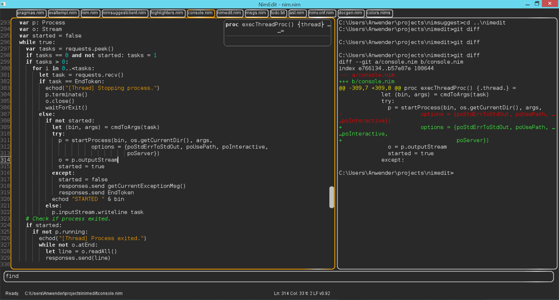 NimEdit is the new upcoming slim IDE/editor for the Nim programming language.
