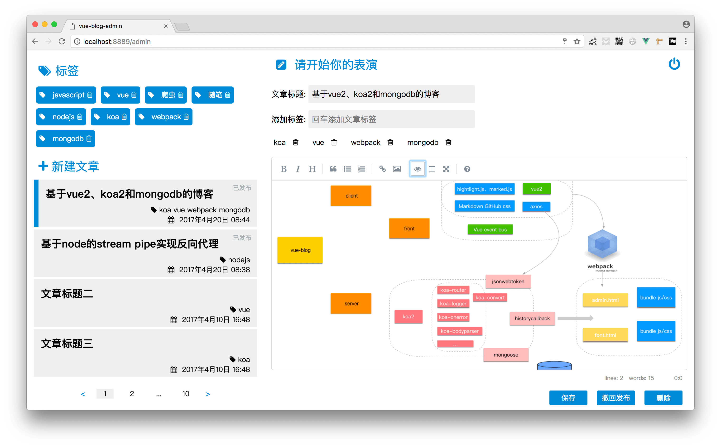 一个使用vue2、koa2、mongodb搭建的单用户博客,支持markdown编辑,文章标签分类,发布文章/撤回发布文章,支持服务端渲染(Server-Side Rendering)