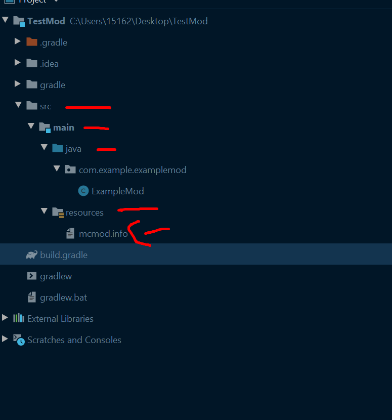 - By default the package name is com.example.examplemod but that is not what we want. We need to change the package to our own. (In my case it is com.miqhtie.testmod)