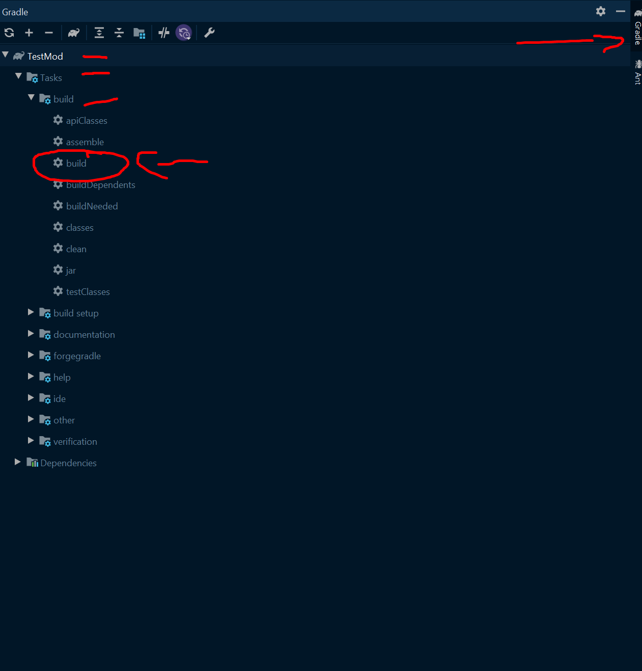 - To build the mod open the gradle tab > TestMod > Tasks > Build and then run the "build" task