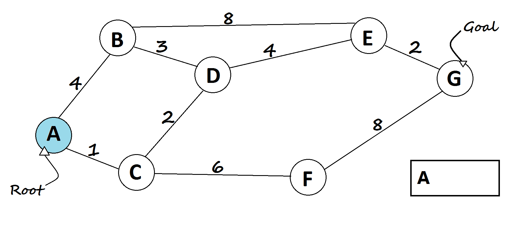 - In every loop, choose the node with the minimum distance from the root node in the queue + heuristic (root node will be selected first).
