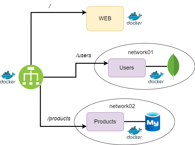 - Web - nodejs app serving webpage, used to interact with products and users API