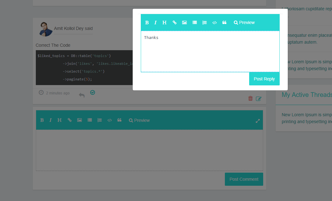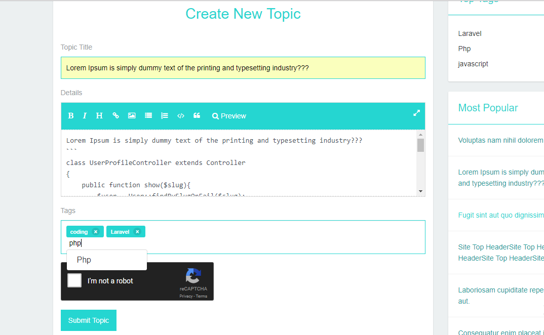 Laravel Forum Laravel Forum Platform. Features Social Login Mail and Database Notification Algolia Instant Search SEO friendly URLs Markdown Editor Code Highlighter Tag UI User Profile Feed Email Confirmation On Registration Topic Views Count Sorting More...