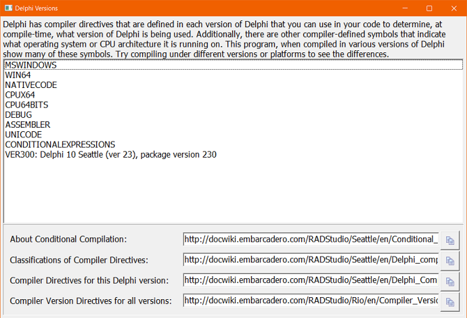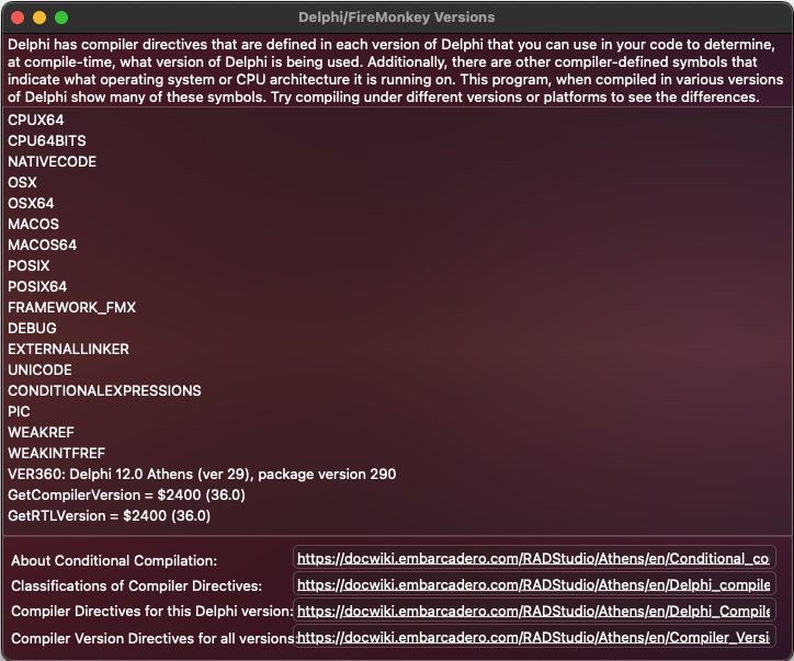 This is a small suite of simple Delphi cross-platform applications that can be compiled in different versions and platforms and which displays text based on compiler directives defined by the compiler.