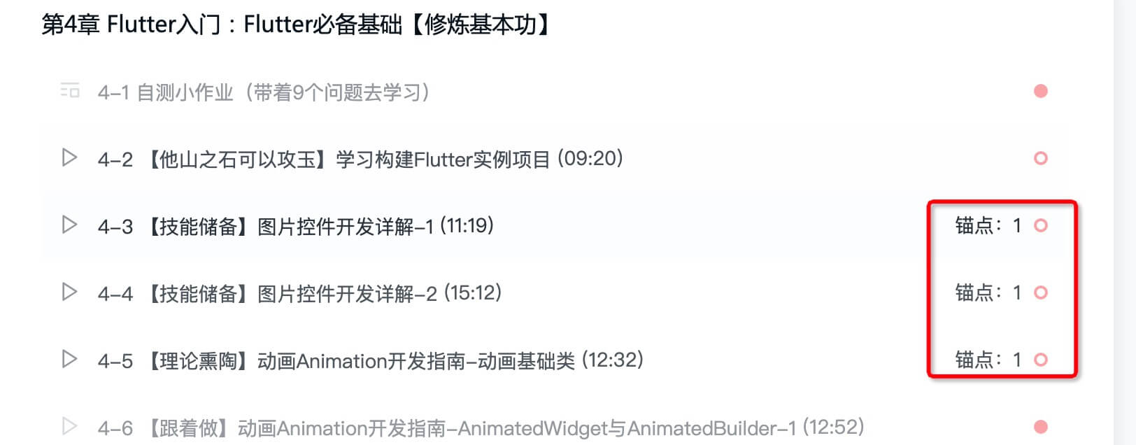 教程中大部分的辅助文档已通过锚点的方式插入到对应的视频中,可以通过课程目录判断是否有锚点: