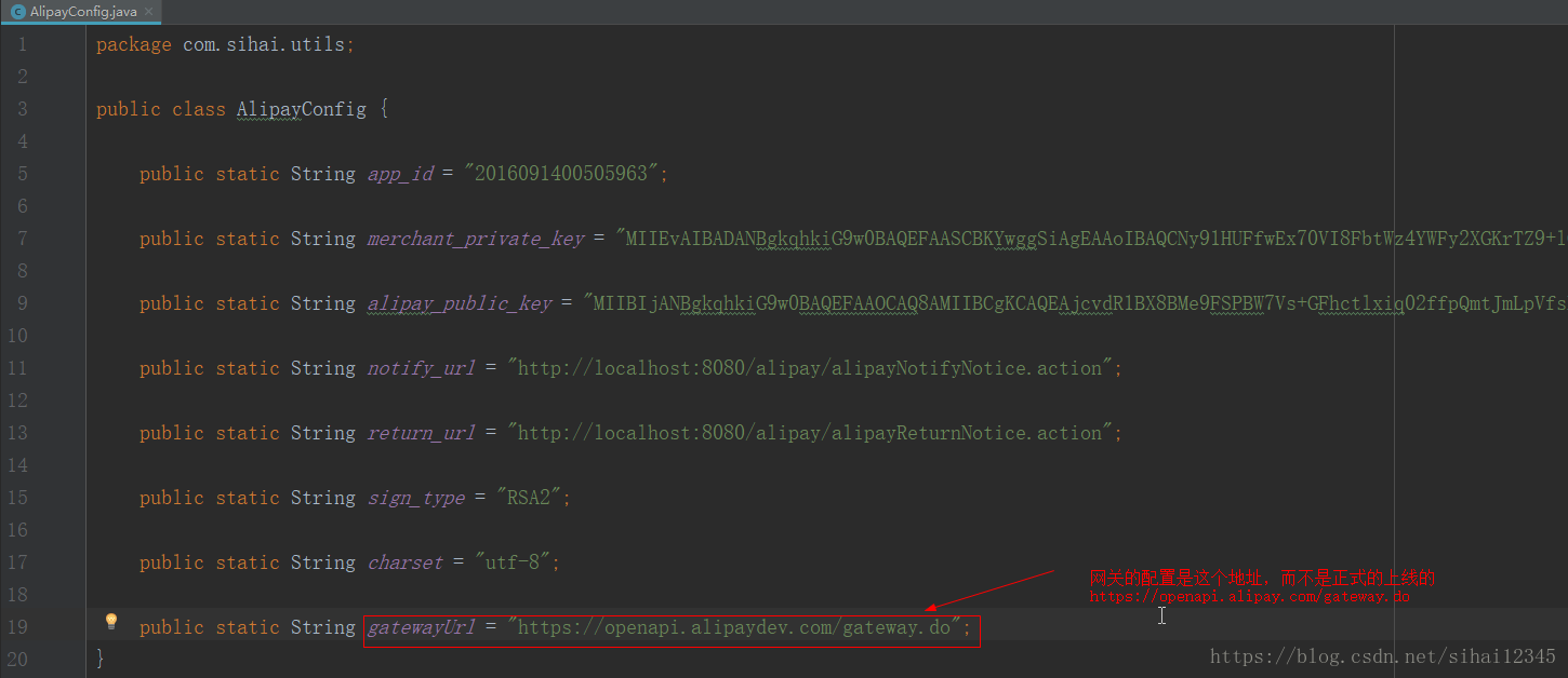 由于我们使用的是沙箱测试环境,测试环境和正式上线的环境的网关是不一样的,如果配置错误,会出现,appid错误的问题。配置如下: