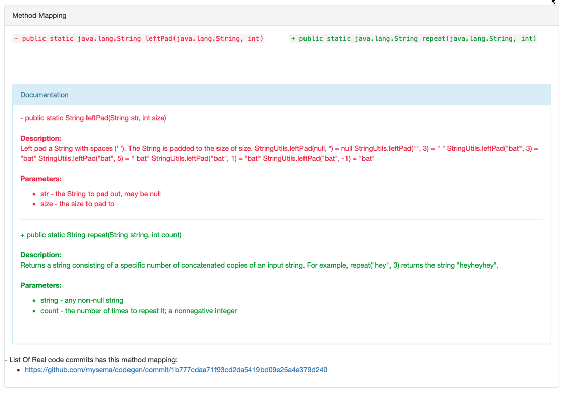 There will be a generated HTML file named "MigrationMapperOutput.html" that has the summary of all migrations detected, and for each migration, all its corresponding method mapping along with their Library documentation. An illutrative example of this file is in the following picture: