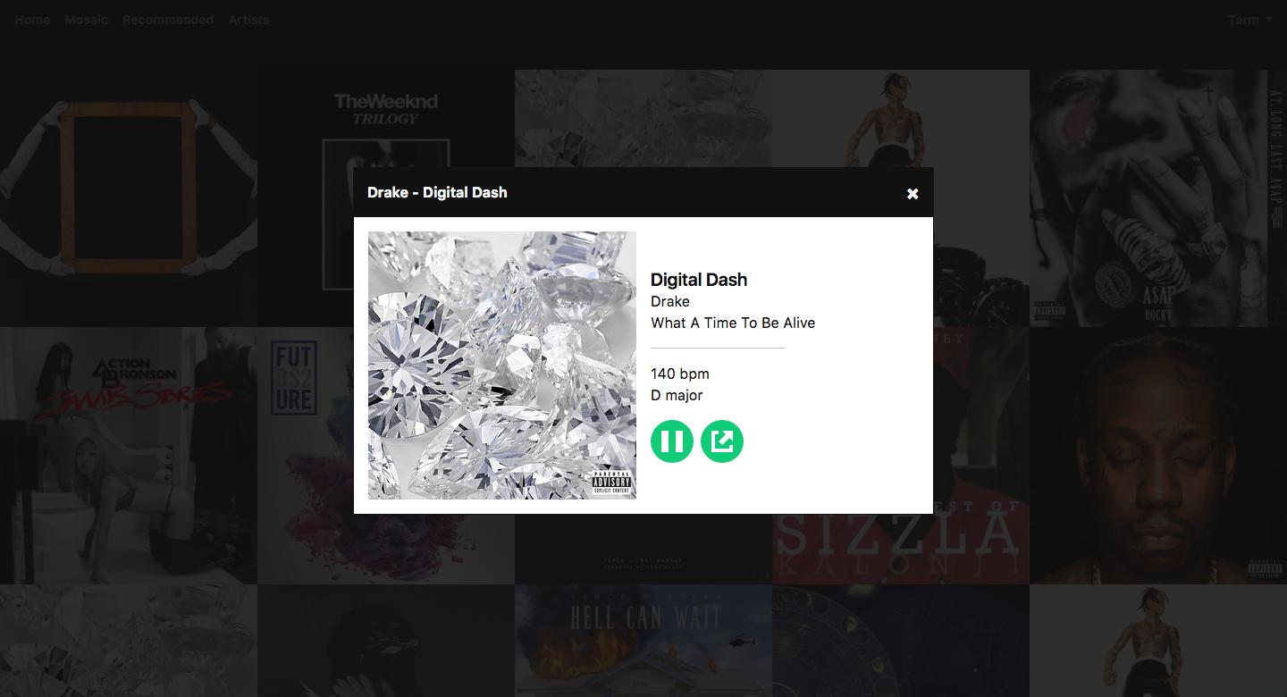 This app connects to the Spotify API using the Implicit Grant Flow to authenticate. I'm a hobby musician with a deep interest in music and music production. I thought it'd be an interesting project to present the data available from the Spotify API in various ways.