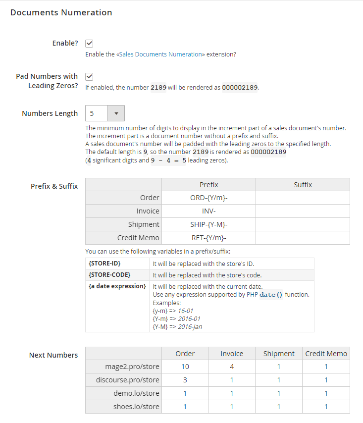 The «Sales Documents Numeration» module for Magento 2 allows you to use a custom numeration for the sales documents: orders, invoices, shipments, and credit memos.