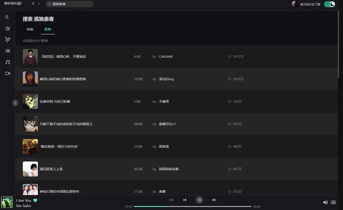 歌单内部搜索歌曲,收藏歌单,编辑歌单,新建歌单.