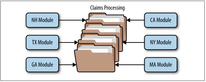 图3-2中显示的文件夹堆栈表示声明处理的核心系统。 它包含保险公司处理索赔所需的基本业务逻辑,不包含任何定制处理。 每个插件模块包含该地区的特定规则。 在该示例中,可以使用定制源代码或单独的规则引擎实例来实现插件模块。 不管实现如何,关键点是地区特定的规则和处理与核心声明系统分离,并且可以进行添加,删除和修改,并且对核心系统或其他插件模块几乎没有影响.