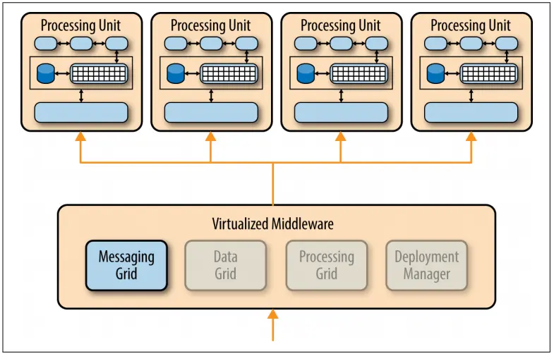 处理单元组件包含应用组件(或应用组件的部分). 这包括基于web的组件以及后端业务逻辑.处理单元的内容基于应用的类型而变化 - 较小的基于web的应用可能被部署到单个处理单元中,而较大的应用可基于应用的功能区域将应用功能分割成多个处理单元。 处理单元通常包含应用程序模块,以及内存中数据网格和可选的异步持久存储器,防止异常丢失数据. 它还包含复制引擎,虚拟化中间件使用复制引擎将一个处理单元所做的数据更改复制到其他活动处理单元。
