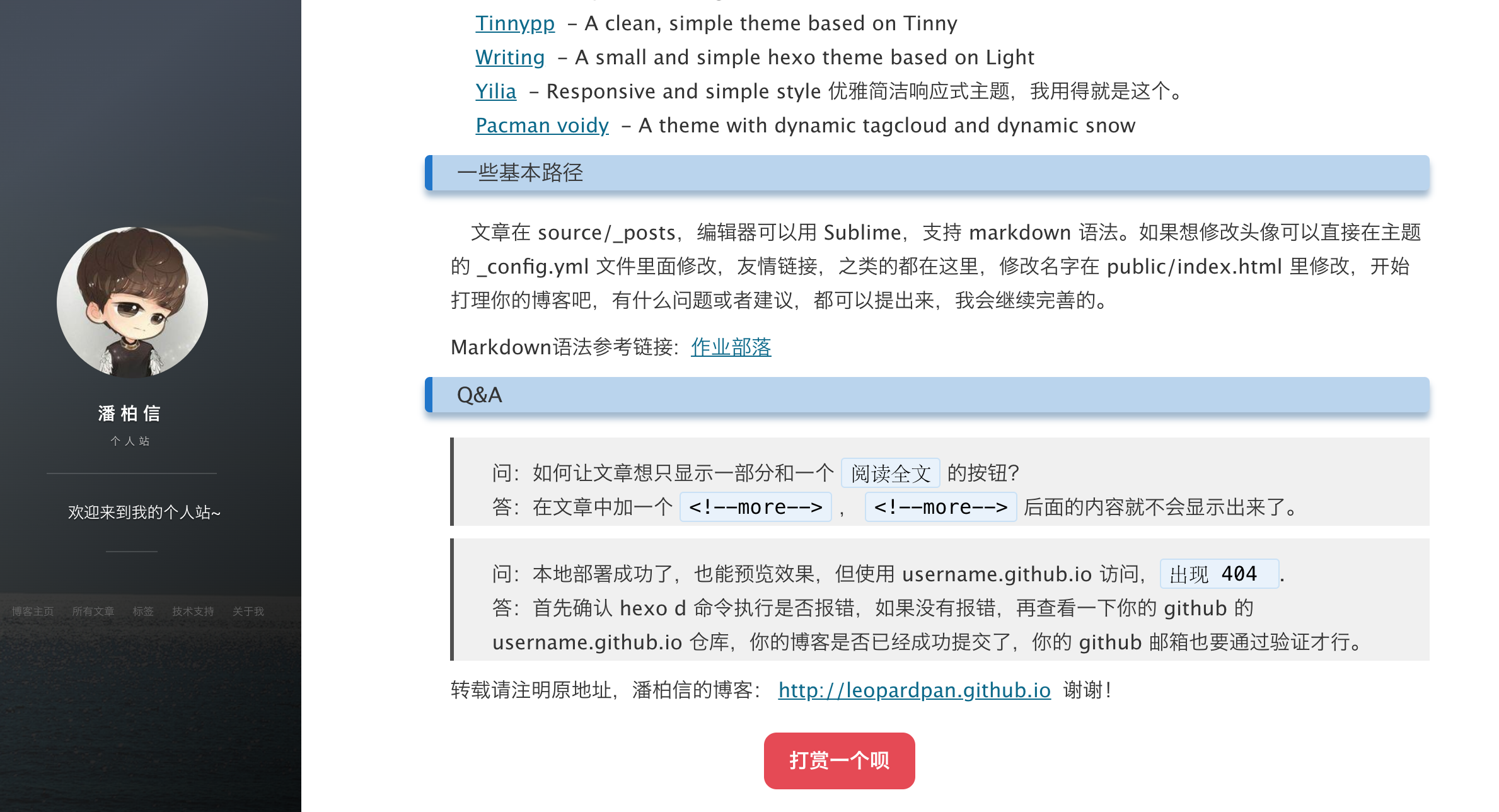 HEXO搭建个人博客 : 使用 HEXO 基于 Github Page 搭建个人博客, 教程里面累计了大量提问和评论,如果你在搭建博客时遇到问题,可以看看这个教程。
