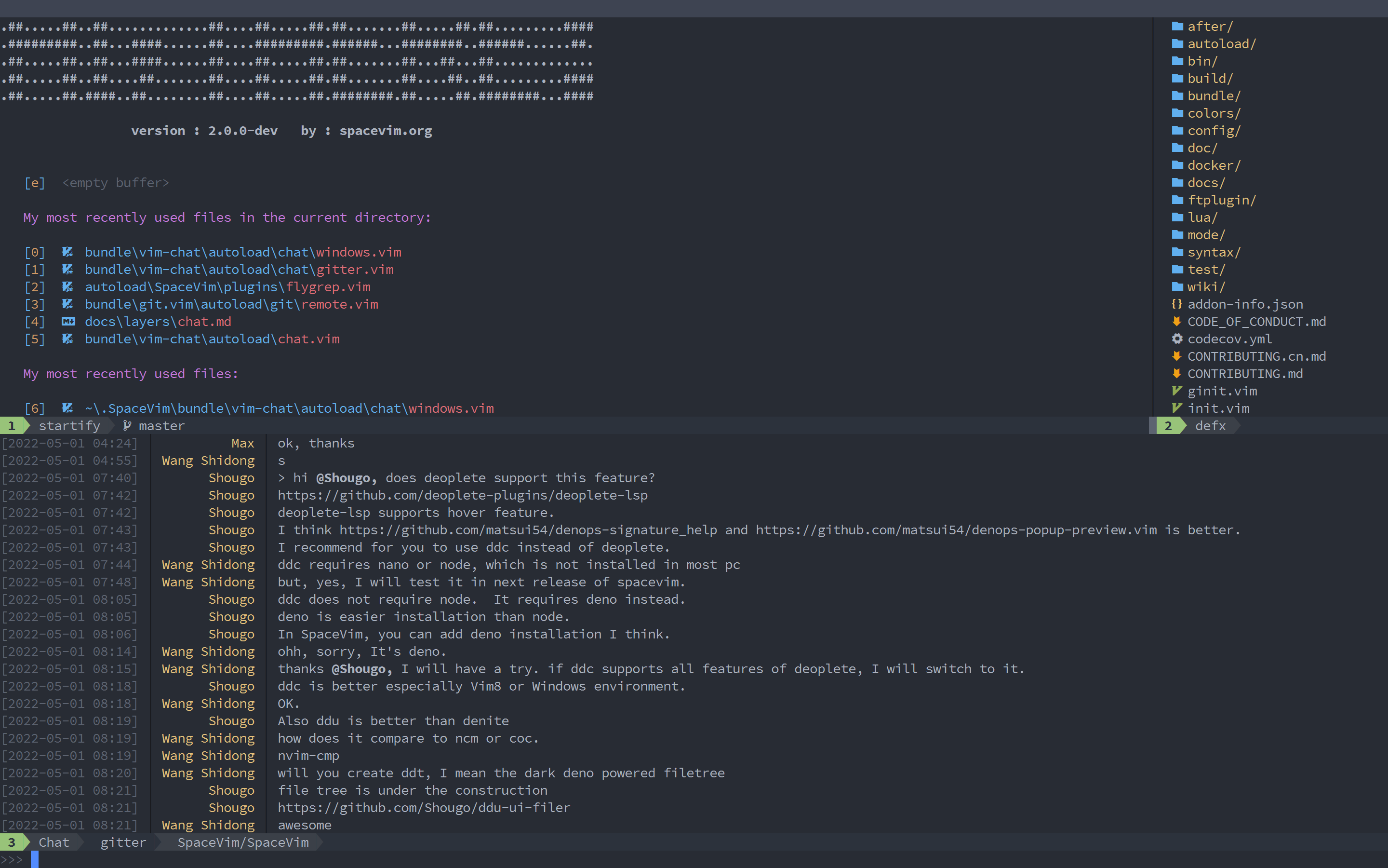 vim-chat The chatting client for vim and neovim. Installation Installation With nvim-plug require("plug").add({ { "wsdjeg/vim-chat", config = function() vim.keymap.set("n", "<leader>h", "<cmd>call chat#windows#open()<cr>", { silent = true }) end, }, })